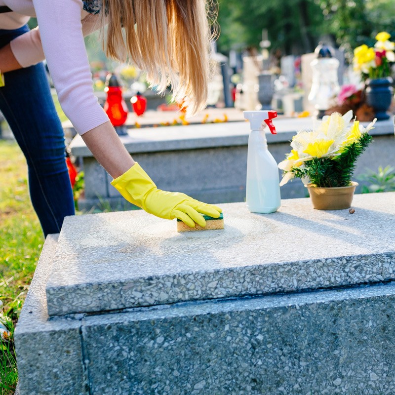 • le nettoyage de la sépulture et de ses ornements à l’aide de produits écologiques respectueux de l’environnement et de la tombe.